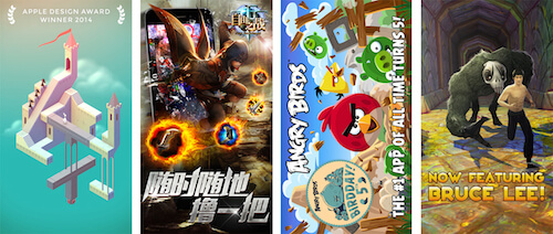 對(duì)游戲應(yīng)用來(lái)說(shuō),你的主要目標(biāo)是調(diào)動(dòng)起用戶的情緒(而不是展示功能)。選擇游戲中史詩(shī)般的場(chǎng)景和驚心動(dòng)魄的畫(huà)面去凸顯游戲的樂(lè)趣。讓用戶在安裝這個(gè)app以前就能夠所感受到快樂(lè)的預(yù)感;用標(biāo)題講故事,通過(guò)展示徽章和獎(jiǎng)勵(lì)來(lái)吸引玩家。