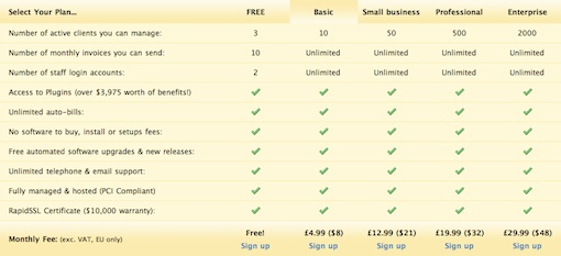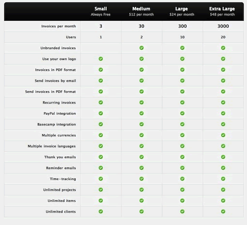 看一下Invoice Machine的例子,表格里除了最上面的三種功能,其他功能的四個條目項都一樣。該表格因此增加了沒有必要的15行。解決方法可以通過一個簡單的公告列表說明“我們的計劃都包括以下功能”,用戶能夠快速看到,他們無論選擇哪個計劃,都會具備這些功能。表格只需要縮短成3-4行,用來顯示不同的部分。我再次重申,表格應(yīng)該讓信息更易讀。如果您的表格不符合這一目標(biāo)則會適得其反。