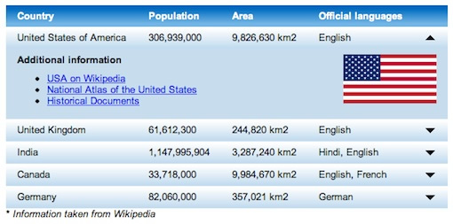 另外一個功能是給表格的特定行增加展開功能??梢园汛罅績?nèi)容放置到一個相對整齊的空間。一個簡單的jQuery小 插件jExpand可以實現(xiàn)這個功能。具體實現(xiàn)可以查看 tutorial from jankoatwarpspeed