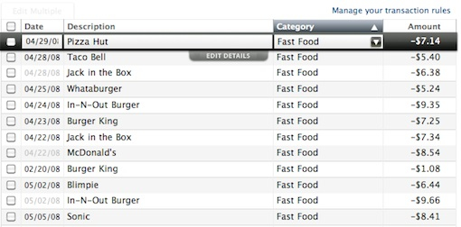 如果表格信息很多,分成幾列,可以對列進行排序,用戶可以選擇按他們希望的方式瀏覽。 Mint.com 對交易列表進行了排序,用戶可以很容易地從按日期瀏覽切換到按種類瀏覽,從而能比較出哪一塊你愿意花很多錢。如上截圖所示,顯然我更喜歡吃油膩的快餐。