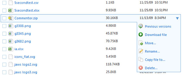這種方式可以很好地讓用戶批量完成多行的操作。選中每一行前面的復(fù)選框,點(diǎn)擊批量操作鏈接或按鈕,用戶可以選中多行進(jìn)行操作。還是以DropBox為例,用戶可以選中多條文件,點(diǎn)擊菜單進(jìn)行批量操作。