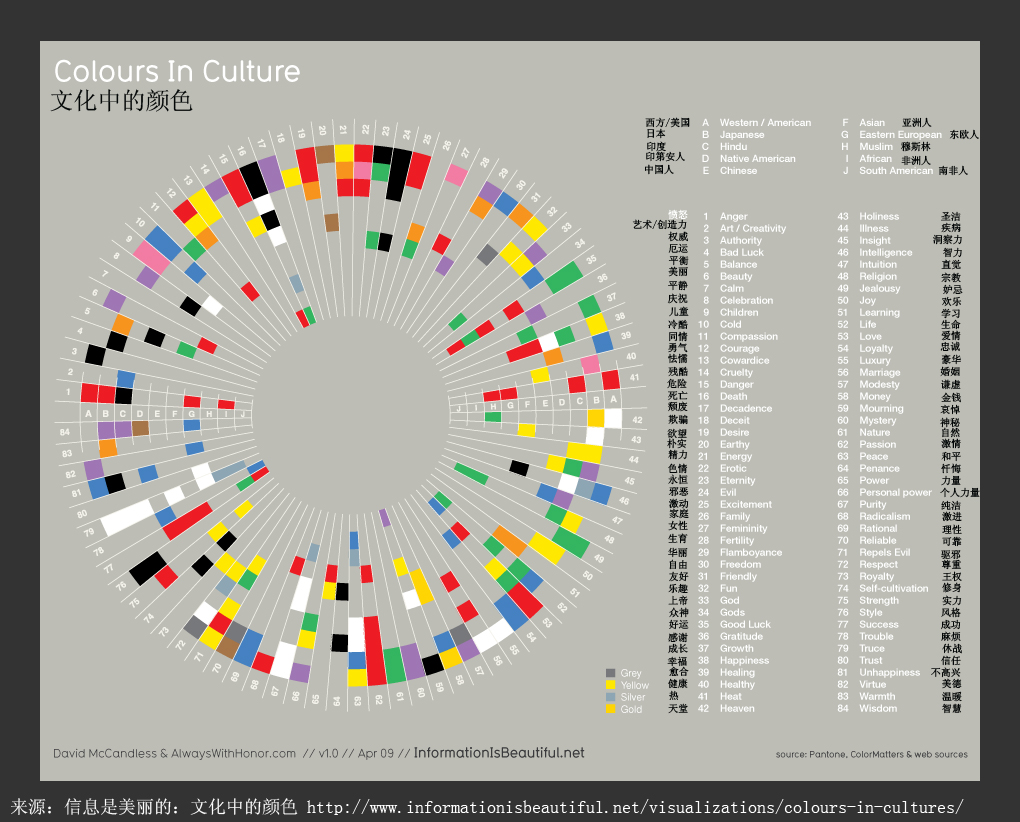 下面的圖表里包含了十種不同的文化,和62種情緒。同心圓代表不同的文化,而小方片代表了不同的情緒。因此,如果你想了解熱日本人對(duì)顏色的感覺,你就要看看這幅圖。如果你想知道在不同文化中什么顏色表示“危險(xiǎn)”的話,你就要縱向的看這幅圖。