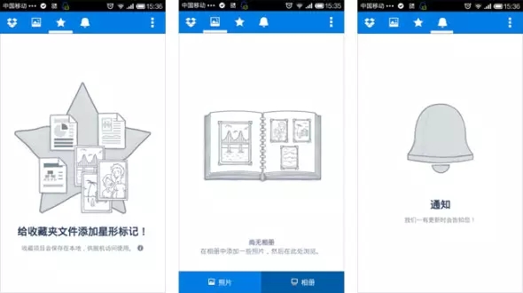 Dropbox是筆者非常喜歡的一款網(wǎng)絡(luò)文件同步工具,產(chǎn)品面臨的問題是需要引導(dǎo)用戶上傳內(nèi)容。應(yīng)用在用戶首次使用收藏、相冊及提醒功能時通過灰階加線條風(fēng)格的圖示和淺白的文字說明告知用戶如何使用這三個功能,畫面在保持一貫品牌風(fēng)格的同時也降低了用戶因為列表內(nèi)空無一物而產(chǎn)生情緒上的挫敗感。