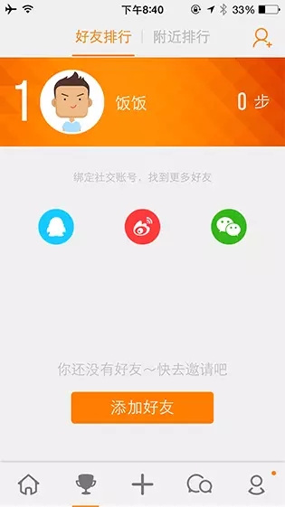 “樂動力”的好友排行頁面,在沒有添加過好友的情況下,該頁面展示了一些社交網(wǎng)絡(luò)的圖標(biāo)和大大的添加按鈕提示用戶可以通過綁定社交賬號來找到更多好友一起PK運動量。