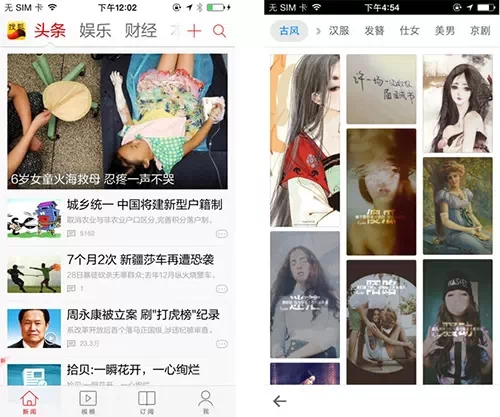 下面的左圖是一個新聞app,采用豎向分欄的布局,模塊化的結(jié)構(gòu)使得信息的展現(xiàn)整潔和嚴(yán)謹(jǐn)。右圖是一個圖片展示app,則采用了三欄的布局,把圖片以這種瀑布流的形式展現(xiàn)給用戶,方便用戶快速瀏覽。但是由于平級的信息,很難區(qū)分主次,而人的視線很難在同一時間聚焦在兩個或者兩個以上的事物上,所以通過圖片錯路排列,使得畫面更為活潑。