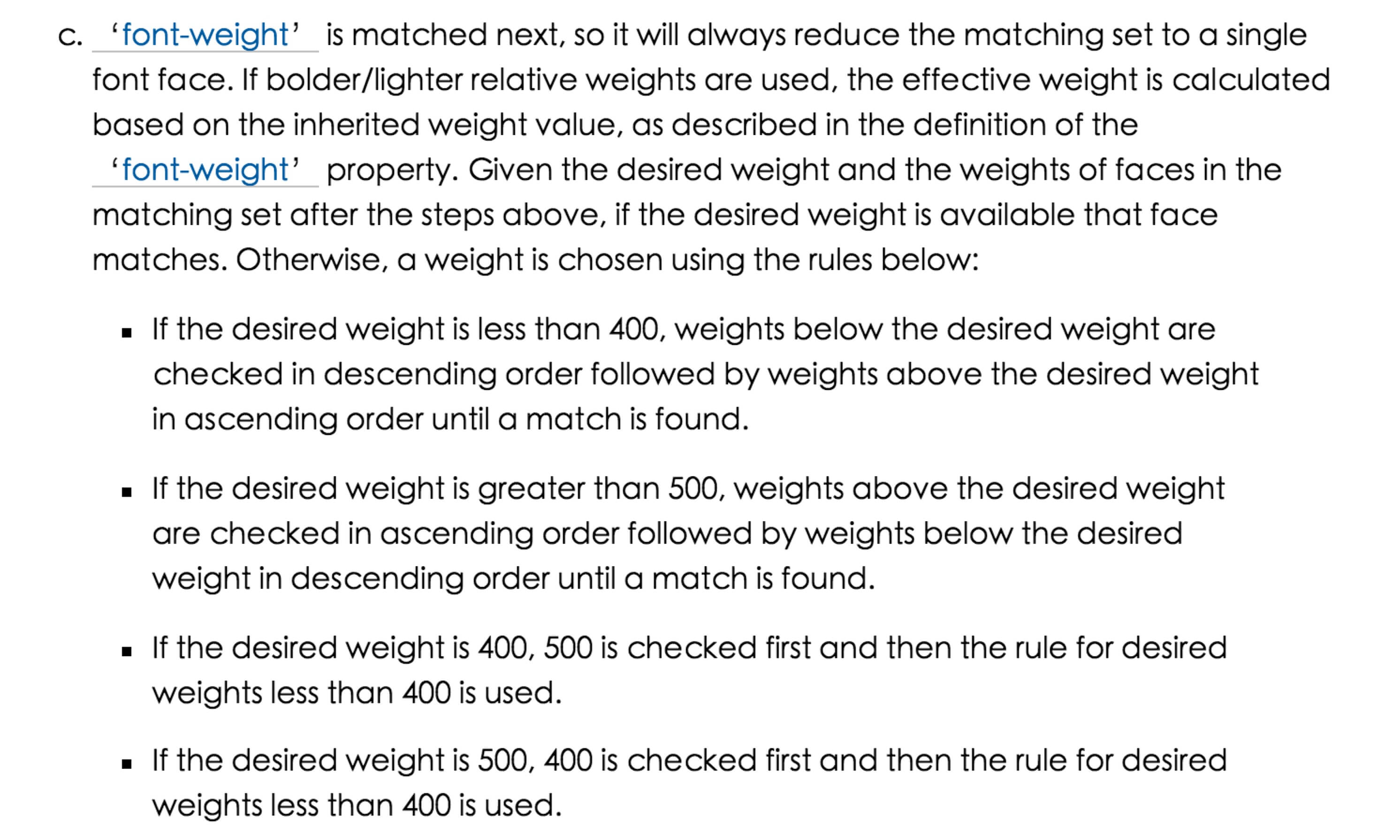 那就是要靠字體匹配算法來(lái)解決。其中關(guān)于font-weight部分是這么提及到的: