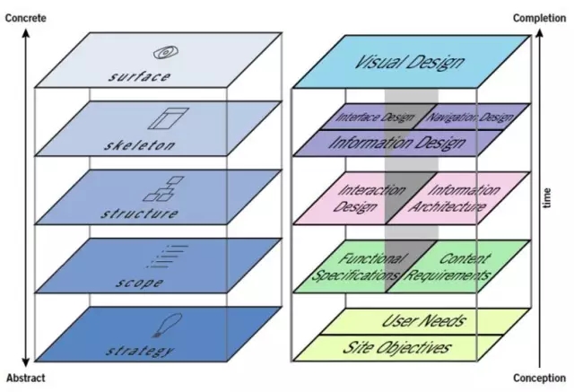 想了解 UI/UX,就一定要了解這張圖,這是 Jesse James Garrett 在2000年發(fā)表的用戶經驗元素一書中所提出:使用者的經驗可分成抽象到具體,也就是由策略、范圍、結構、骨架、表層所構成。
