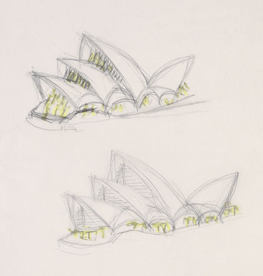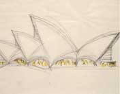 (Juon Utzon),在和家人旅行途中偶然看到了澳洲政府向海外征集悉尼歌劇院設(shè)計方案的廣告。他對遠在天邊的悉尼城根本一無所知,但是他從小生活在海濱漁村的 生活經(jīng)歷,和與兩個來自澳大利亞的姑娘對悉尼的描述中獲取靈感,與其說是完成了一個建筑的設(shè)計方案,倒不如說是隨手畫了幾張潦草的速寫。甚至當他寄出自己 的設(shè)計方案時,他都沒有料到,又一個“安徒生式的童話”將要在南半球上演。 約翰·烏特松