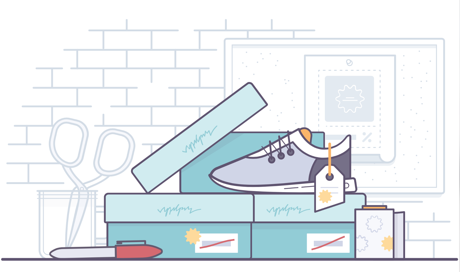這個(gè)元素在線上和線下有相似之處。盡管我不認(rèn)為它是一類比喻,但在產(chǎn)品設(shè)計(jì)中我還是將它單獨(dú)拿出來(lái)說(shuō)。比喻常用來(lái)展現(xiàn)觸動(dòng)人心的部分,那是一件事情或者一個(gè)行動(dòng)產(chǎn)生的積極感覺(jué)。不過(guò),對(duì)于內(nèi)容傳遞給用戶的方式,團(tuán)隊(duì)更傾向于中立的寫(xiě)實(shí)表達(dá)。不必告訴用戶我們的感受如何,只需簡(jiǎn)潔傳達(dá)信息。用插畫(huà)的專業(yè)術(shù)語(yǔ)來(lái)表達(dá)則是:我們只愿意通過(guò)繪制寫(xiě)實(shí)狀態(tài)下的物品,來(lái)幫助用戶理解線上的內(nèi)容。當(dāng)然,談到產(chǎn)品時(shí),我們大多是在電腦上作畫(huà),比如,你可以繪制20多個(gè)互相連接的空狀態(tài)頁(yè)面,來(lái)表達(dá)重復(fù)性。這也是我們?cè)跒橛脩魝鬟_(dá)內(nèi)容時(shí)增加的一種類比方式。比如下圖的例子,線上電子商務(wù)可以讓用戶通過(guò)優(yōu)惠碼輸入實(shí)現(xiàn)折扣,那么線下實(shí)體銷售折扣該如何表達(dá)呢?可能是一堆貼紙和帶著折扣價(jià)格的紅色標(biāo)記。我們能借助全新懷舊風(fēng)格的插畫(huà)為用戶帶來(lái)愉悅,同時(shí)還能保持中立,只是簡(jiǎn)單清晰的表達(dá)信息。