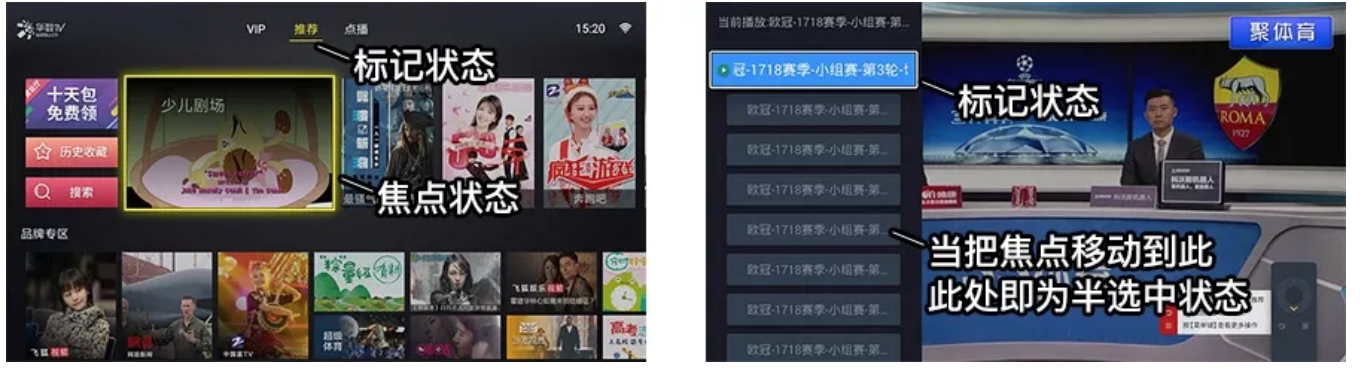 可能需要簡單講述一下“標(biāo)記狀態(tài)”和“半選中狀態(tài)”:“標(biāo)記狀態(tài)”在PC和手機(jī)端也非常常見,比如告知用戶所在位置在哪里的Tab標(biāo)記;而“半選中狀態(tài)”是“焦點狀態(tài)”的一種情況,即移動到某個焦點后,不進(jìn)行加載或觸發(fā)操作,需按“OK鍵”才觸發(fā),如圖15所示。這種狀態(tài)在早期電視盒子性能不足、在Tab切換時經(jīng)常需要使用,因為如果直接切換焦點時就加載,可能會造成卡頓。