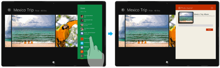 我們還可以進(jìn)一步利用Metro應(yīng)用獨(dú)特的功能特性,讓不同的應(yīng)用訪問和使用彼此所包含的文件,例如在其他應(yīng)用中使用相片日志應(yīng)用里的圖片。通過這樣的功能,用戶無(wú)需首先在相片應(yīng)用中將圖片下載到本地,然后再上傳到另外的應(yīng)用中;系統(tǒng)會(huì)將所有支持文件選擇器契約的應(yīng)用都看作是一個(gè)可以在任何地方讀取的文件存儲(chǔ)位置。