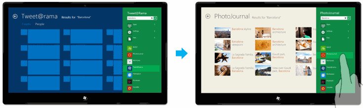 如上圖所示,用戶當(dāng)前處于Tweet@Rama 應(yīng)用的環(huán)境當(dāng)中,出于某種需求,該用戶希望搜索相片應(yīng)用當(dāng)中所有包含“Barcelona”關(guān)鍵詞的相片。輸入了關(guān)鍵詞之后,用戶在搜索托盤中選擇相片應(yīng)用,使其成為搜索結(jié)果提供者,這時(shí)相片應(yīng)用就會(huì)自動(dòng)加載,并顯示相關(guān)的搜索結(jié)果。這種方式使得用戶無(wú)需手動(dòng)在當(dāng)前運(yùn)行的應(yīng)用與搜索目標(biāo)應(yīng)用之間進(jìn)行切換。