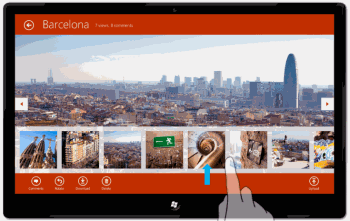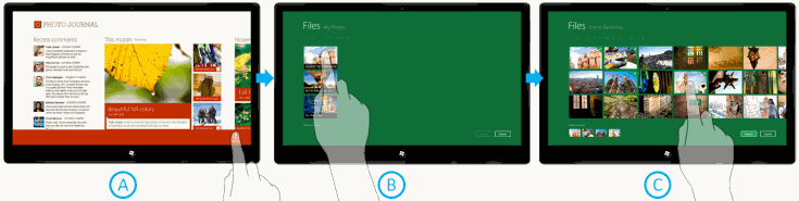 無(wú)論在iOS還是Windows中,這兩個(gè)手勢(shì)在很多時(shí)候都被用作放大或縮小內(nèi)容對(duì)象的尺寸。不過對(duì)于Metro應(yīng)用來(lái)說(shuō),它們還可以通過Semantic Zoom來(lái)實(shí)現(xiàn)內(nèi)容層級(jí)間的導(dǎo)航。用戶可以捏合某個(gè)內(nèi)容對(duì)象,來(lái)進(jìn)入它所在的相關(guān)內(nèi)容組。不過,當(dāng)用戶正在以全屏模式瀏覽單張相片的時(shí)候,捏合與張開的手勢(shì)還是會(huì)被用來(lái)調(diào)整圖片的尺寸。