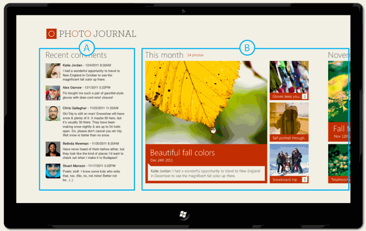在iPad應(yīng)用中,設(shè)計(jì)師通常需要考慮兩種屏幕定向方式以及對(duì)應(yīng)的界面設(shè)計(jì)方案。而Windows 8可以運(yùn)行在多種設(shè)備上,包括平板和臺(tái)式機(jī)。因此,我們要考慮到顯示空間更大的情況,讓用戶在大尺寸設(shè)備中能夠看到更多的內(nèi)容。網(wǎng)格布局可以使設(shè)計(jì)方案更好的適應(yīng)于不同的屏幕定向方式及不同類型的顯示設(shè)備,例如針對(duì)縱向空間更大的設(shè)備來(lái)顯示更多的當(dāng)月特色圖片。