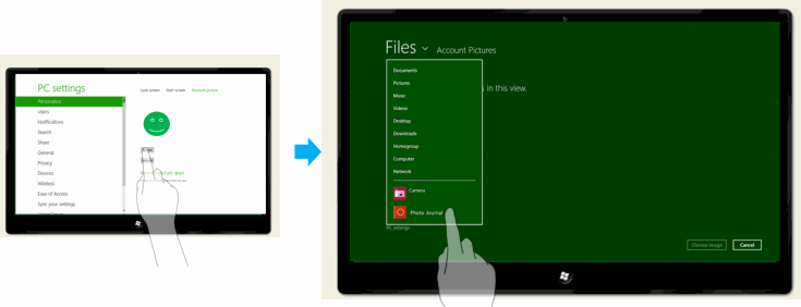 如上圖所示,用戶在PC Settings界面中點(diǎn)擊“瀏覽”,以更換頭像圖片。由于我們的相片日志應(yīng)用支持文件選擇器契約,所以在接下來(lái)的文件選擇界面中,就會(huì)看到應(yīng)用名稱出現(xiàn)在列表當(dāng)中,用戶可以選擇該應(yīng)用當(dāng)中存儲(chǔ)的相片作為新的頭像。