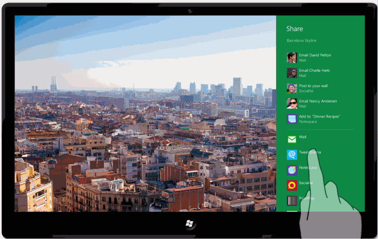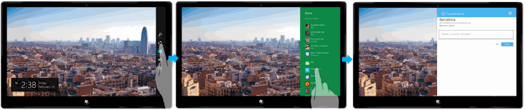 而在Metro風(fēng)格的應(yīng)用當(dāng)中,我們會(huì)使用分享契約 。這種技術(shù)方案簡(jiǎn)化了設(shè)計(jì)與開發(fā)方面的工作,因?yàn)槲覀儾恍枰獮橛脩粲锌赡苡玫降纳鐣?huì)化服務(wù)而將它們與每個(gè)單獨(dú)的應(yīng)用都逐一整合起來(lái)。不僅是社會(huì)化服務(wù),用戶還可以將信息保存共享至平臺(tái)上所有那些使用了分享契約的應(yīng)用,而開發(fā)者們則無(wú)需擔(dān)心外部服務(wù)的接口問題。站在用戶的角度,他們可以在charms bar這個(gè)固定的地方完成有關(guān)分享的操作。