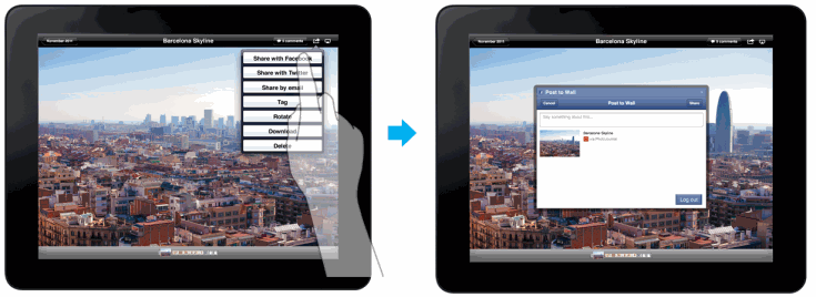 iPad版本:用戶需要點(diǎn)擊導(dǎo)航欄右側(cè)的相關(guān)動(dòng)作按鈕,并從展開的列表中選擇“分享到Facebook”。如果要使應(yīng)用支持更多的分享服務(wù),開發(fā)人員必須在該應(yīng)用當(dāng)中逐一增添。