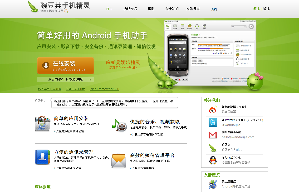 5 豌豆莢手機(jī)精靈官網(wǎng),非常實(shí)用的應(yīng)用軟件類布局,功能、關(guān)注、宣傳、友鏈布局合理,大大的焦點(diǎn)圖上書:在線安裝,用戶下載方便。該有的都有,所以在意料之中,相對平常。