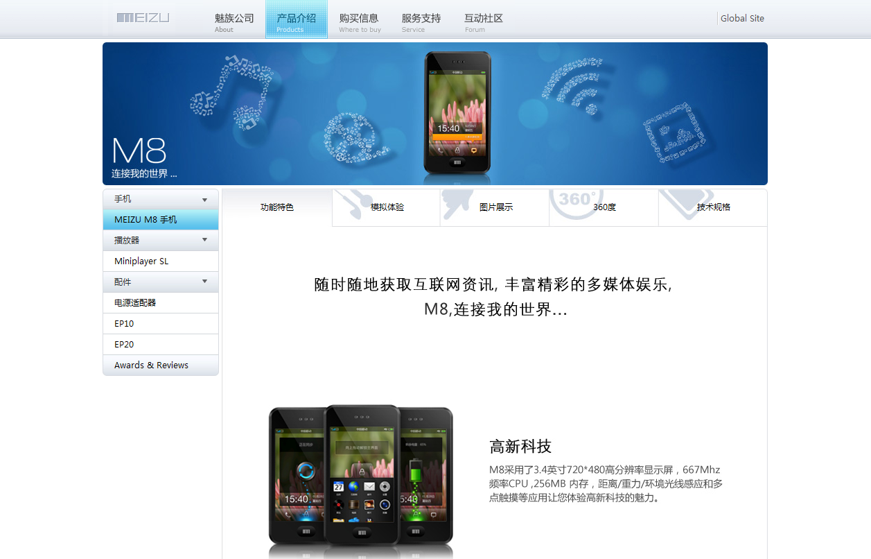 4 魅族公司官網(wǎng),也是藍(lán)藍(lán)個人非常喜歡的風(fēng)格,格局大方,恢宏穩(wěn)重,沒有多余的東西,極簡單而條理清晰,重點(diǎn)的圖設(shè)計(jì)精致、表達(dá)需求明確,而且唯美,大量空白顯的頁面不擁擠,有想象的空間。