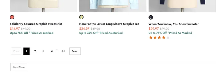 據(jù)我所知,無限流是由播客《Your Undivided Attention》的聯(lián)合主持人Aza Raskin發(fā)明的。他在2006年為一家名為“人性化”的用戶界面公司工作,那個(gè)時(shí)候人們還在使用“分頁”的設(shè)計(jì),而他則想創(chuàng)建一種能夠取替分頁的方法。分頁是將內(nèi)容切割成幾個(gè)頁面,通過底部的導(dǎo)航欄頁簽選擇可以跳轉(zhuǎn)的頁面,我們現(xiàn)在仍然能在一些電商網(wǎng)頁版中看到這種設(shè)計(jì)的蹤影,如下圖所示。