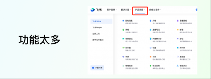 去哪里了解呢?一般企業(yè)官網(wǎng)都會把自家產(chǎn)品列出來,方便客戶查看,咱們也可以順著這條路線去走。就拿飛書舉例,從導(dǎo)航欄的“產(chǎn)品功能”我們可以看到,主要是四條線,咱們不用把每條線都挖得很細(xì)致,但是起碼要有大概的認(rèn)知,知道這是個(gè)什么東西,做什么的,最好上手體驗(yàn)體驗(yàn)。