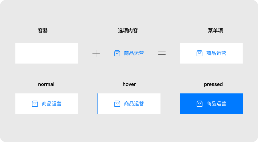 導(dǎo)航菜單是由多個(gè)菜單項(xiàng)集合組成的。菜單項(xiàng)由容器+選項(xiàng)內(nèi)容(圖標(biāo)+文字或文字)組成,交互行為是點(diǎn)擊菜單熱區(qū)后跳轉(zhuǎn)到相應(yīng)目標(biāo)頁(yè)面。