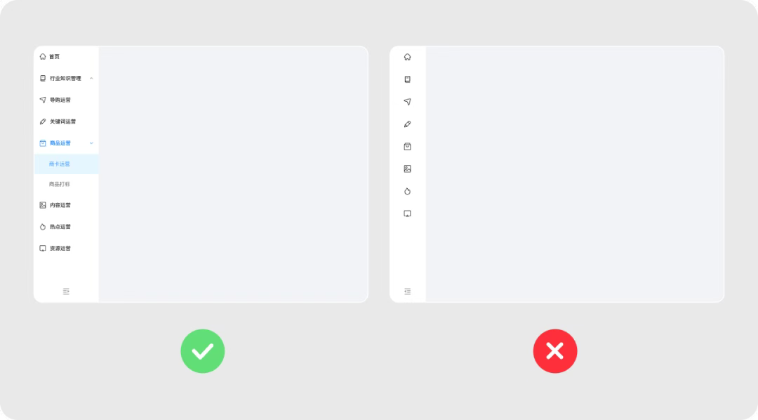 縱向?qū)Ш街糜陧?yè)面左側(cè),垂直延展,選項(xiàng)優(yōu)先級(jí)由上而下遞減。用戶可以在不同選項(xiàng)中快速切換,操作效率較高;縱向空間可以容納更多菜單選項(xiàng),并且可以延展二級(jí)分類。拓展性比較高,適合專注操作的后臺(tái)類產(chǎn)品。