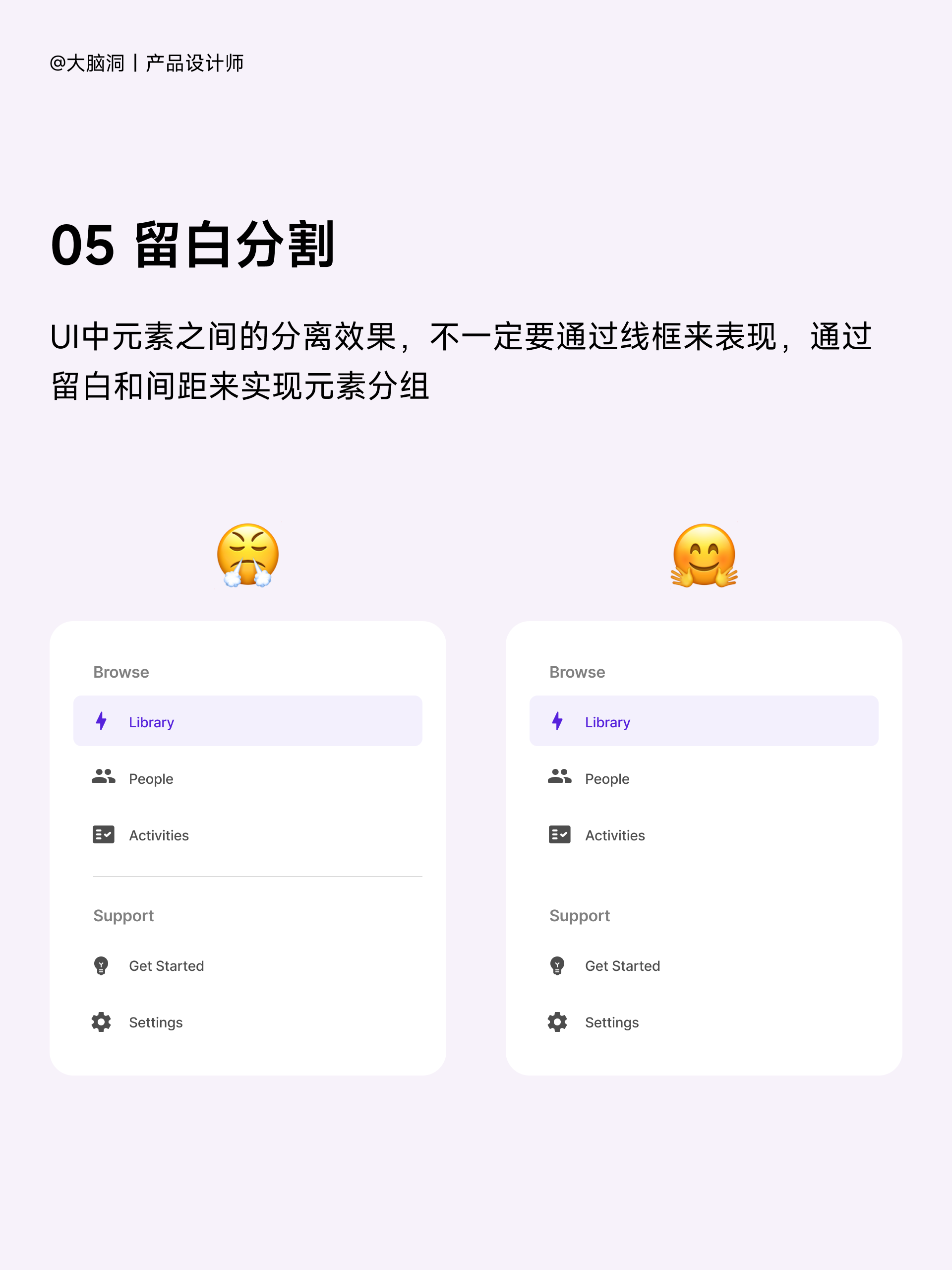 2)組織:組織必須提供的功能。在視覺(jué)層面上,做到信息分層清晰;在產(chǎn)品層面上,做到根據(jù)內(nèi)容做功能分組,讓用戶更方便查閱和尋找。分塊越少,選擇越少,用戶負(fù)擔(dān)就越小。