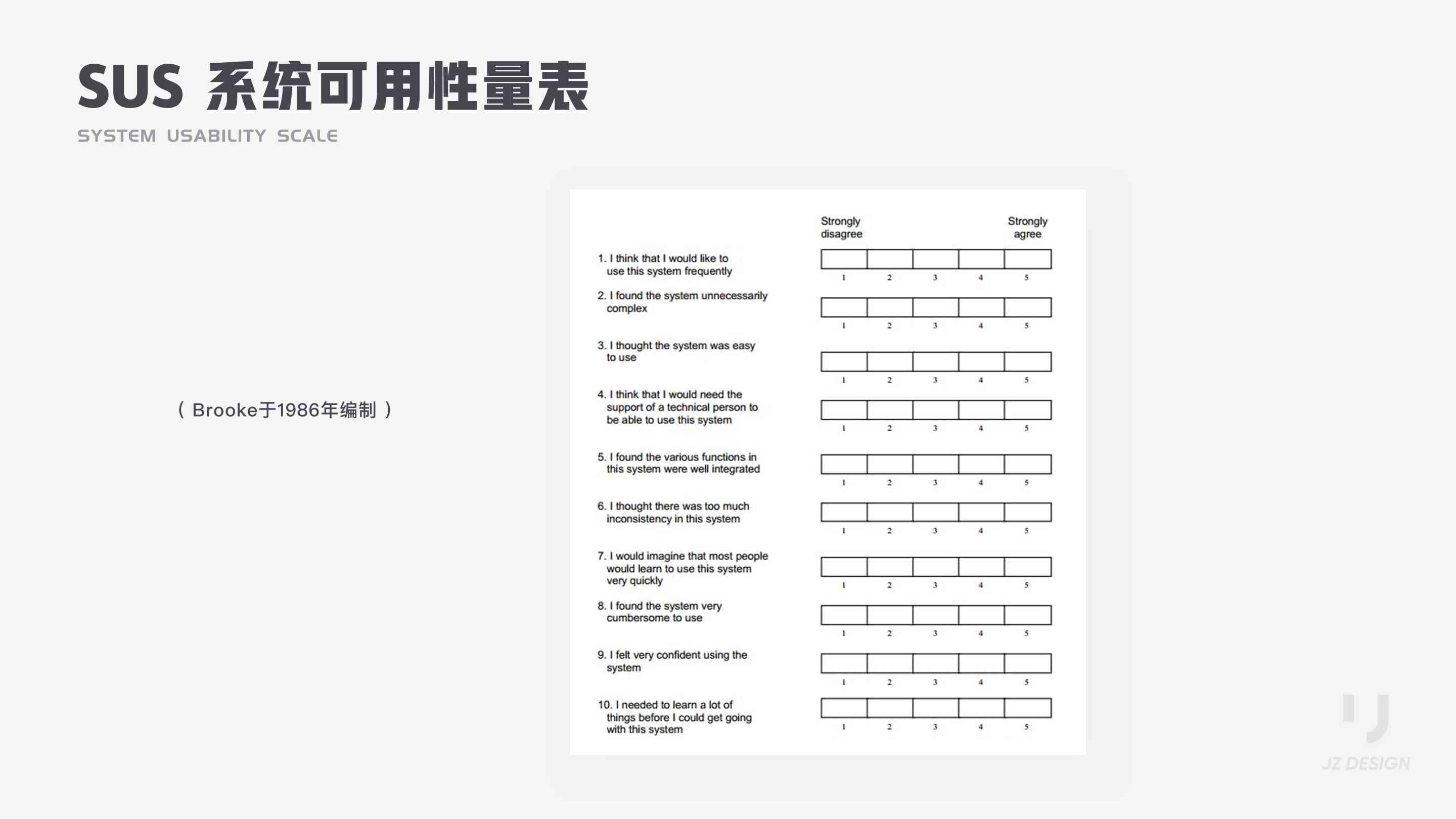 SUS 全稱(chēng) System Usability Scale ,系統(tǒng)可用性量表。SUS最初是Brooke于1986年編制,可以科學(xué)地量化用戶體驗(yàn),用于完成一系列任務(wù)場(chǎng)景后,對(duì)產(chǎn)品或系統(tǒng)整體宏觀的感知可用性測(cè)量。