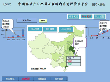內容管理分為兩大模塊,視頻管理和網頁管理。內容管理部分,重點呈現全網TOPN熱點資源的各省的IDC引入情況、IDC服務流量、各省點擊量分布情況。